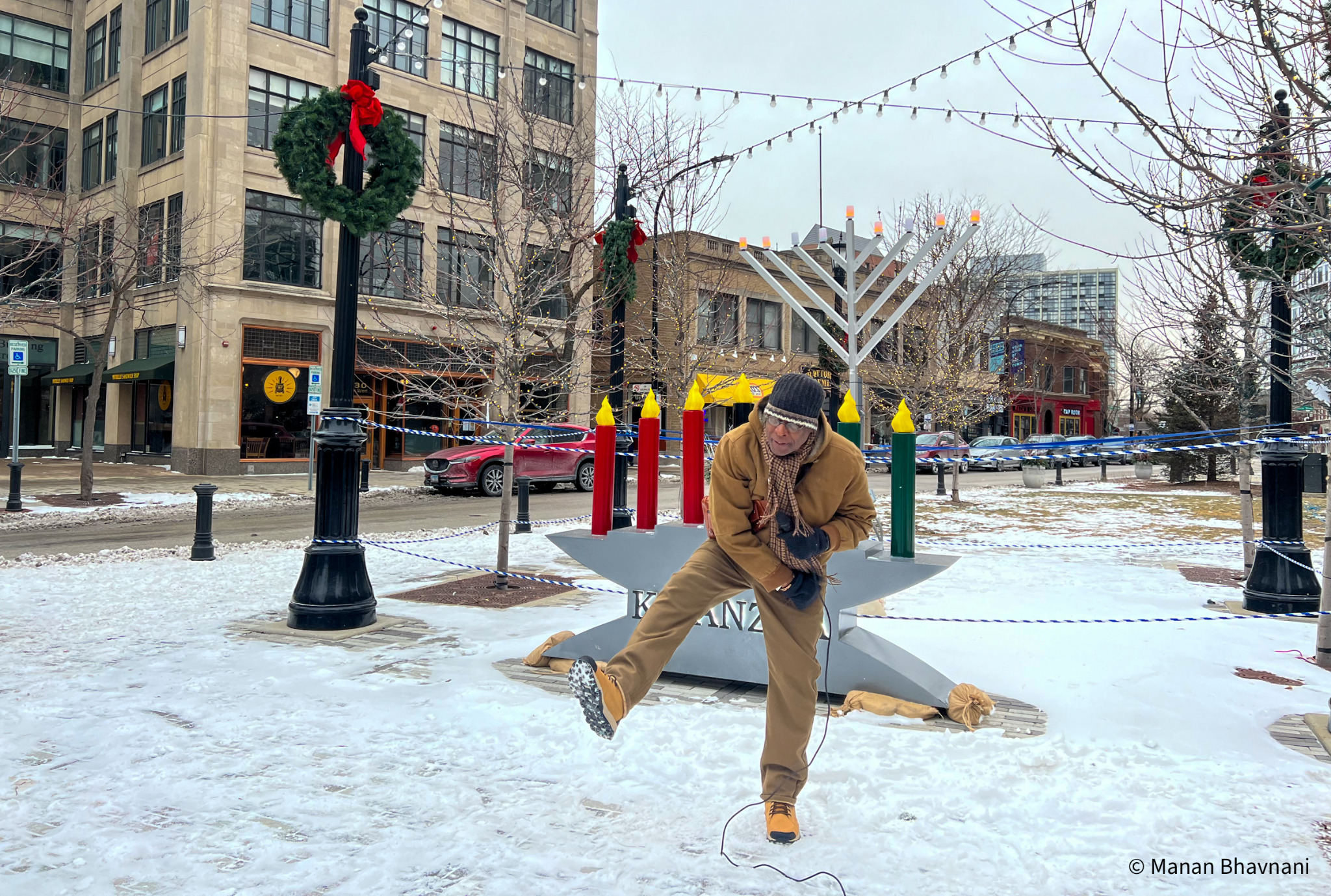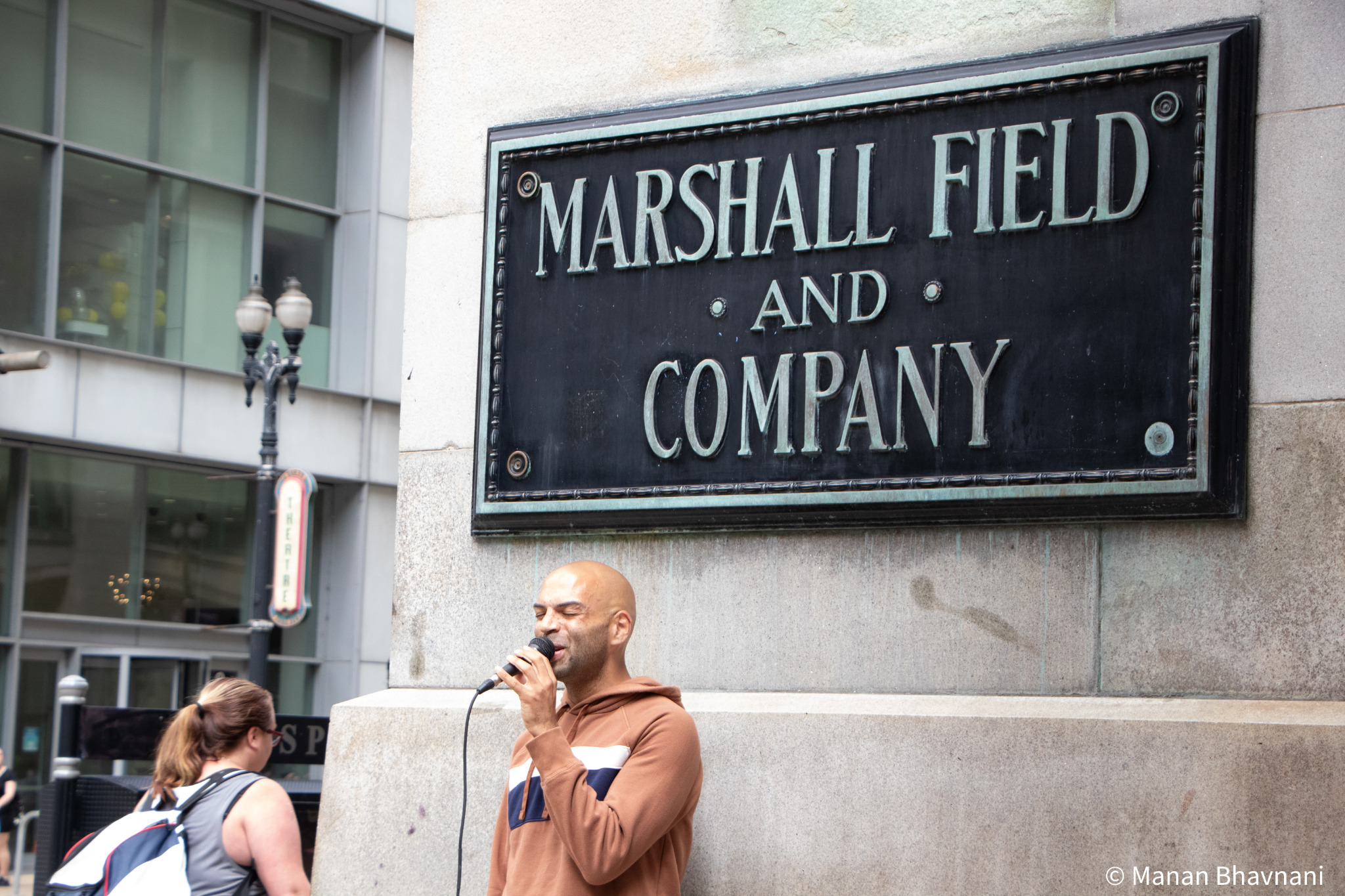 Tim Rhoze, artistic director of Fleetwood-Jourdain Theatre, leads a chant of “Harambee,” Swahili for “come together,” to conclude the celebration. Evanston, USA, 2022.